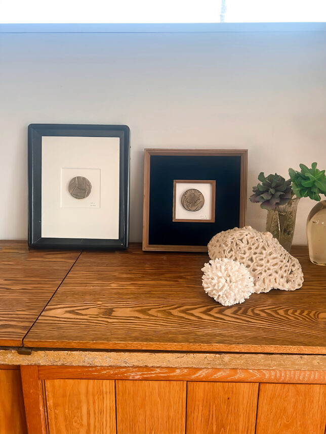 この可愛いらしい思い出の品を、ただ仕舞っておくのではなく、暮らしの中で感じながら置いておきたくて、ちょ太の銅鏡と同じく額装することに。