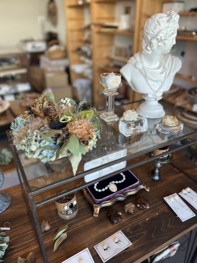 また今回は、リースに加え、アップサイクルのアクセサリーやランプシェードも展示させていただきました。