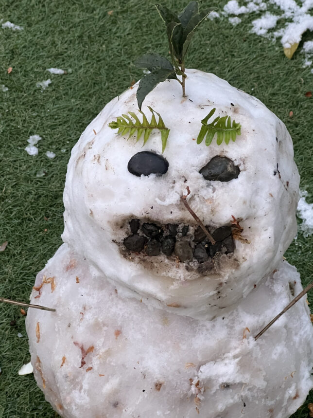 しばらくして覗いてみると、想像以上に凝った雪だるまができあがっていました。