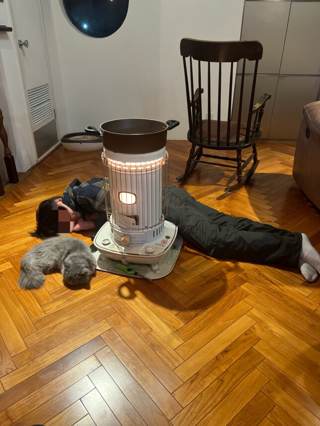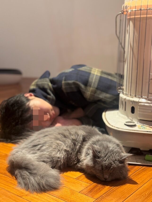 ストーブのぬくもりの中で二人並んで眠っていました。