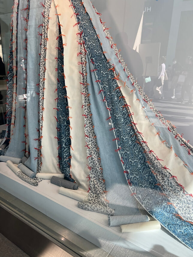 この店内ディスプレイやショーウィンドウで使用されたデニムと刺繍を、新たな形へとつないでいく取り組みに、 関わらせていただくことになりました。