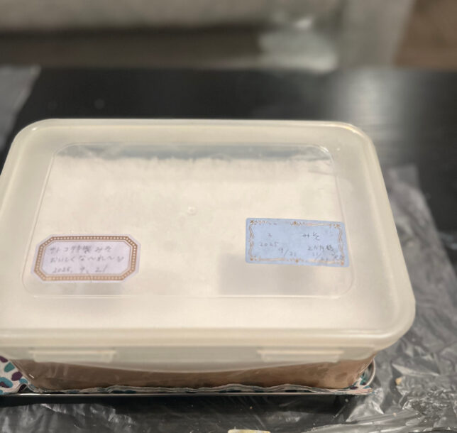 友人が講師を務めたワークショップで教えてもらい仕込みたてほやほやのお味噌。透明のタッパなので、横から熟成の過程が見られるのも楽しみ。美味しくなあれ~♪