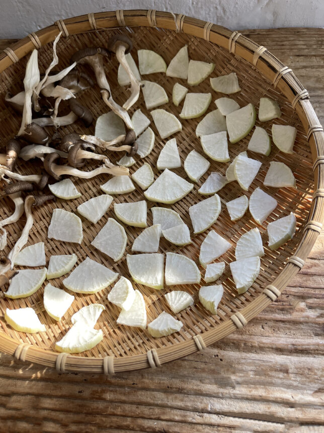 これも、ベランダで干した大根としめじ。冷蔵庫に中途半端に余っていたので、ベランダへgo!
