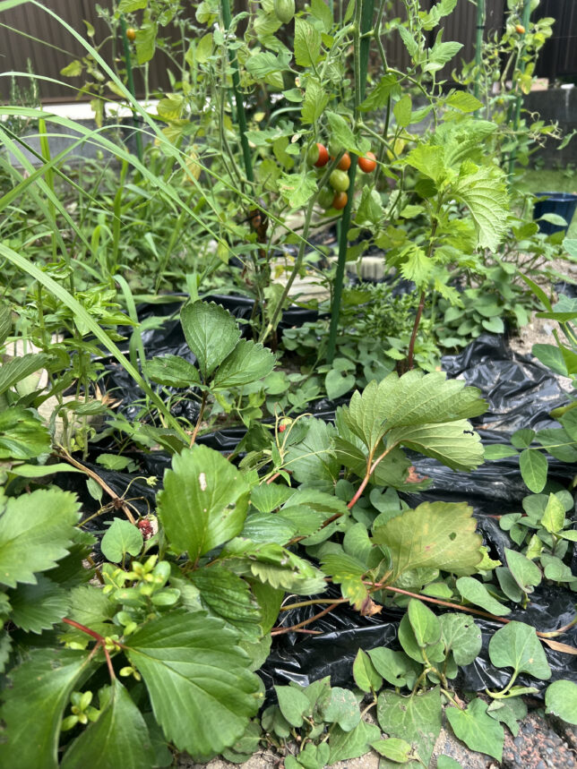 自然農法?!(^^;)雑草と共存でお恥ずかしいですが、庭の片隅のミニトマトと苺。